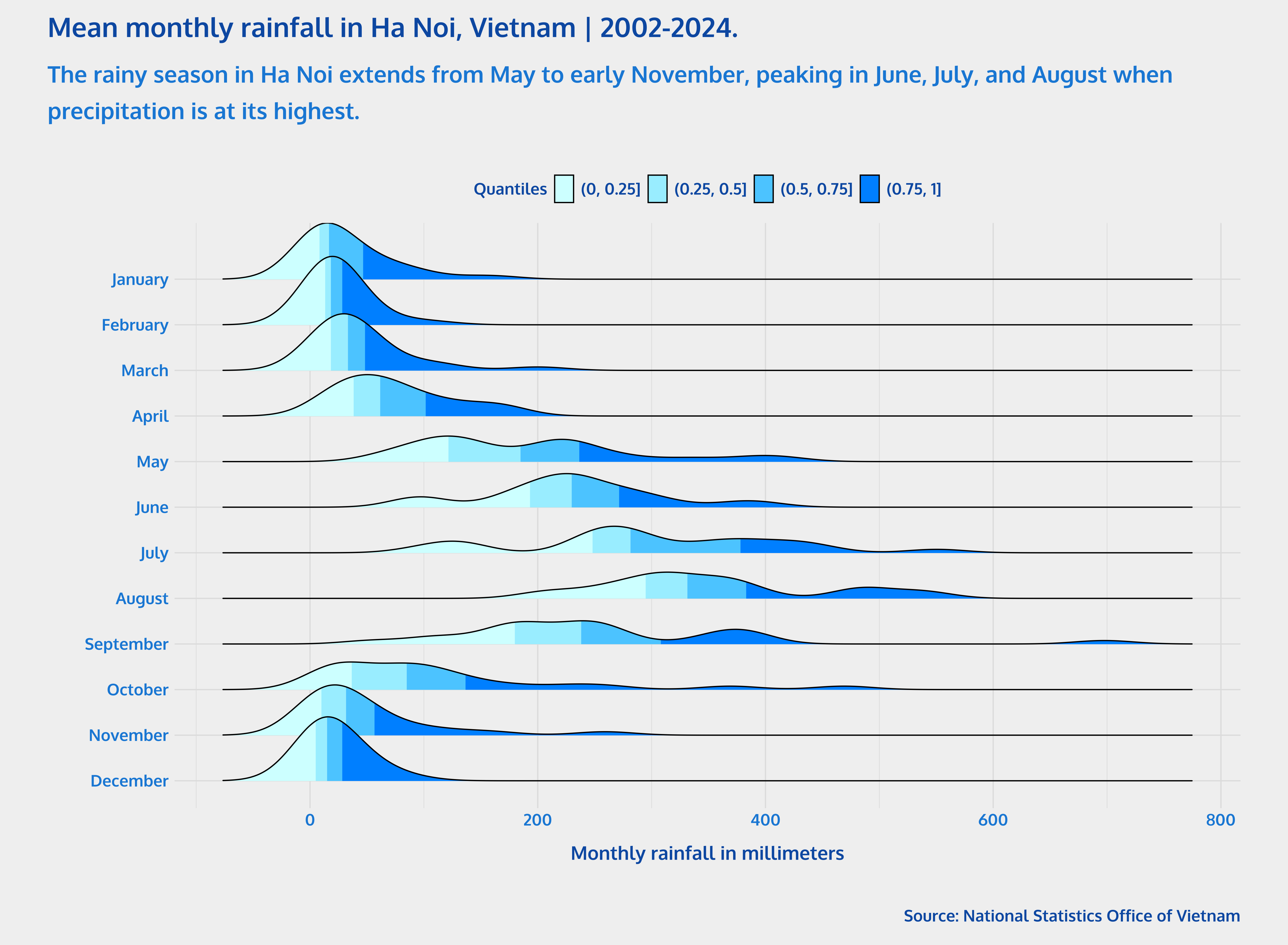 subtitle = str_wrap("The rainy season in Ha Noi extends from May to early November, peaking in June, July, and August when precipitation is at its highest.", width = 110)